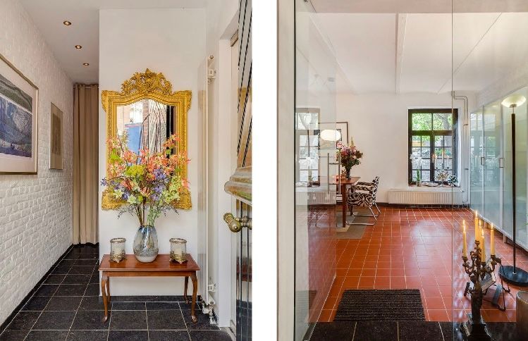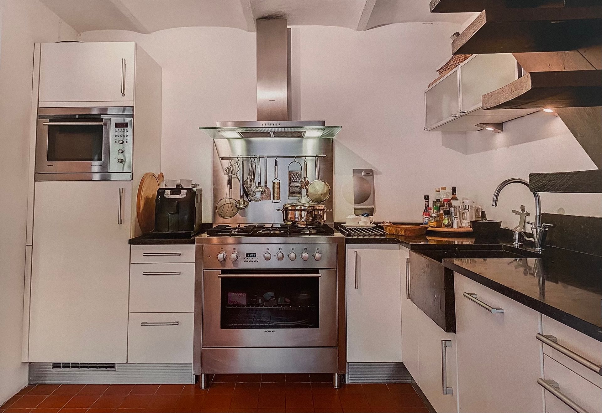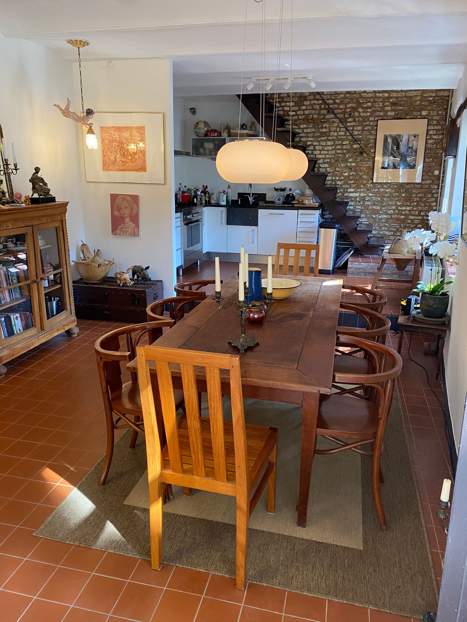 Er is een garderobe, toilet en separate wasruimte voor wasmachine en droger. Meteen rechts een glazen deur die toegang geeft tot de eetkamer (circa 23 m2) en de open woonkeuken (circa 14m2) met een sfeervol authentiek gewelfd plafond.
