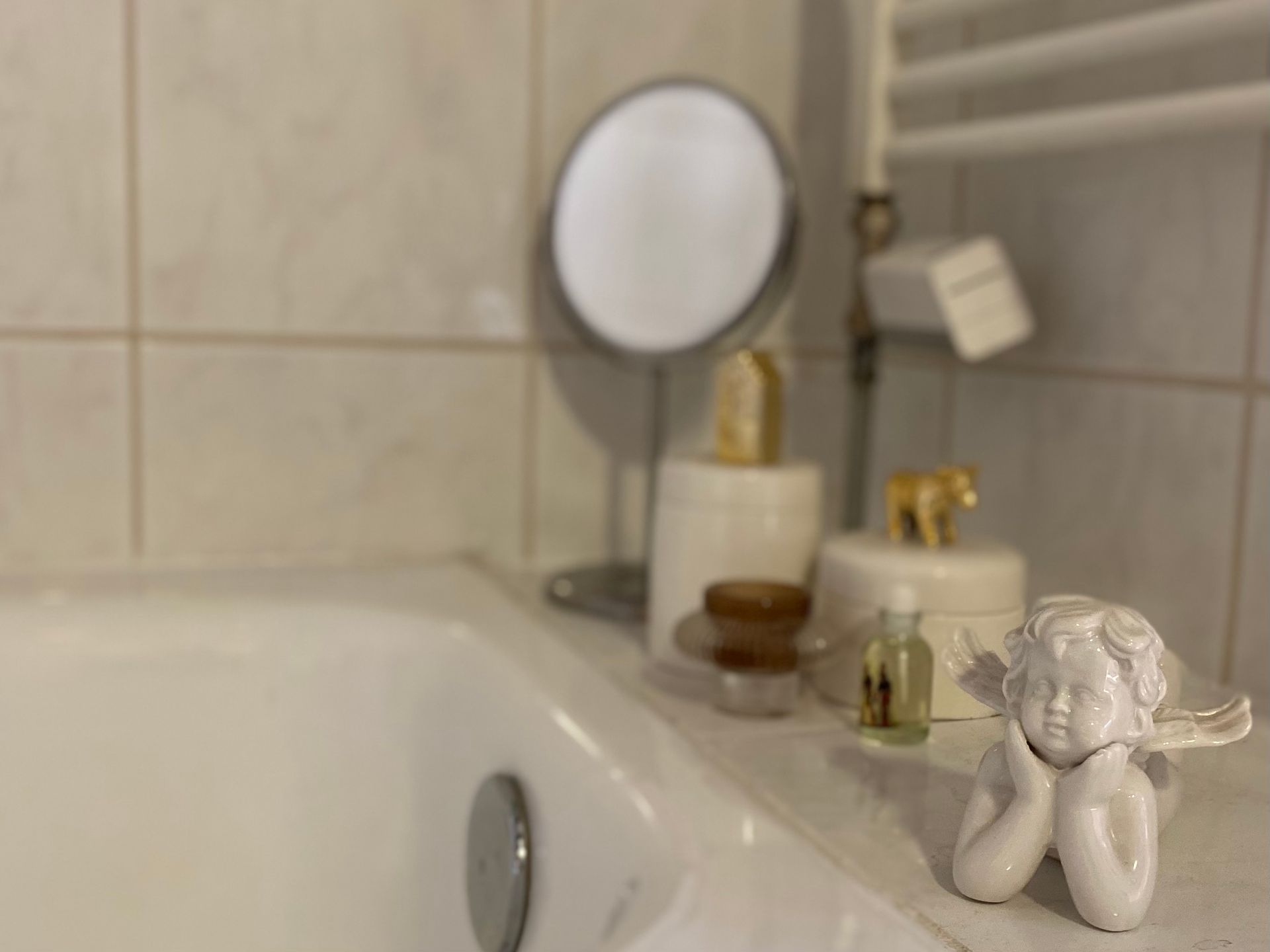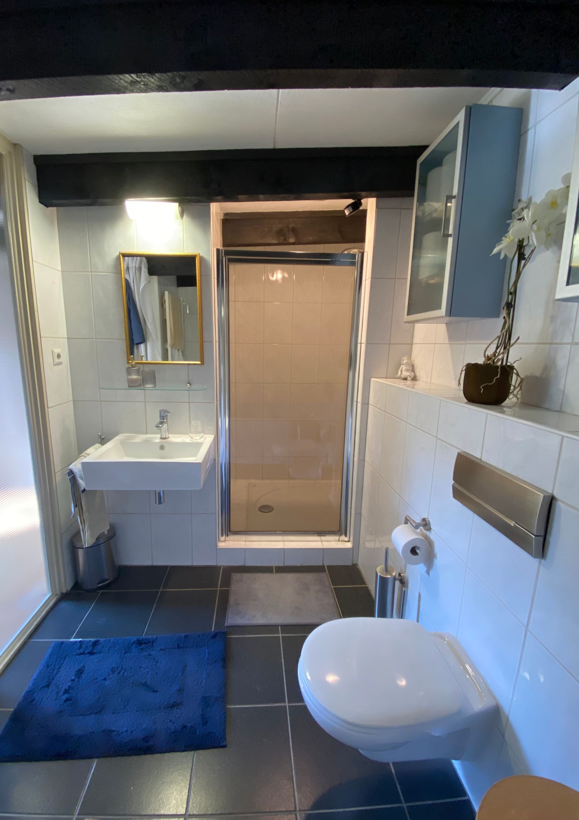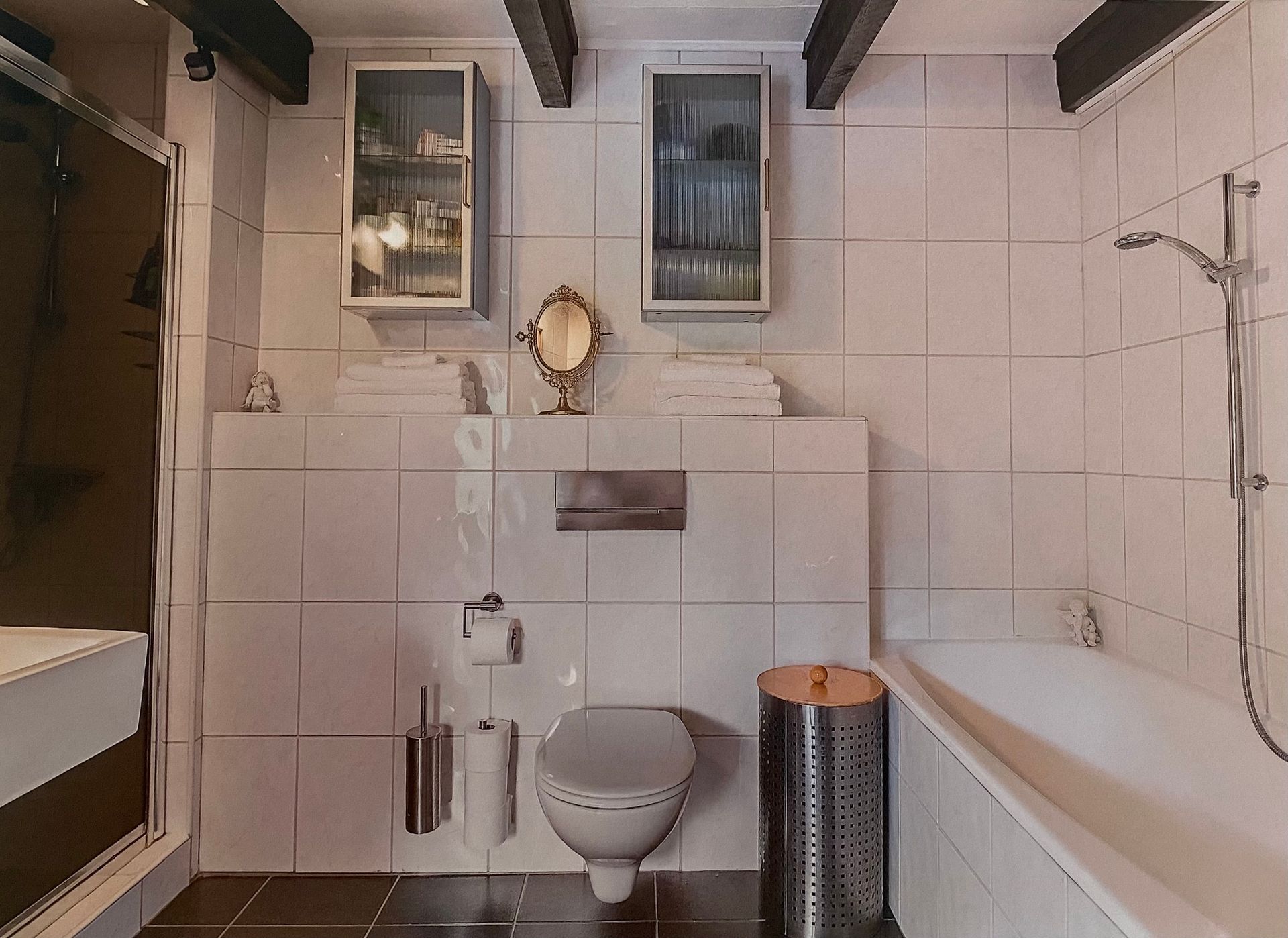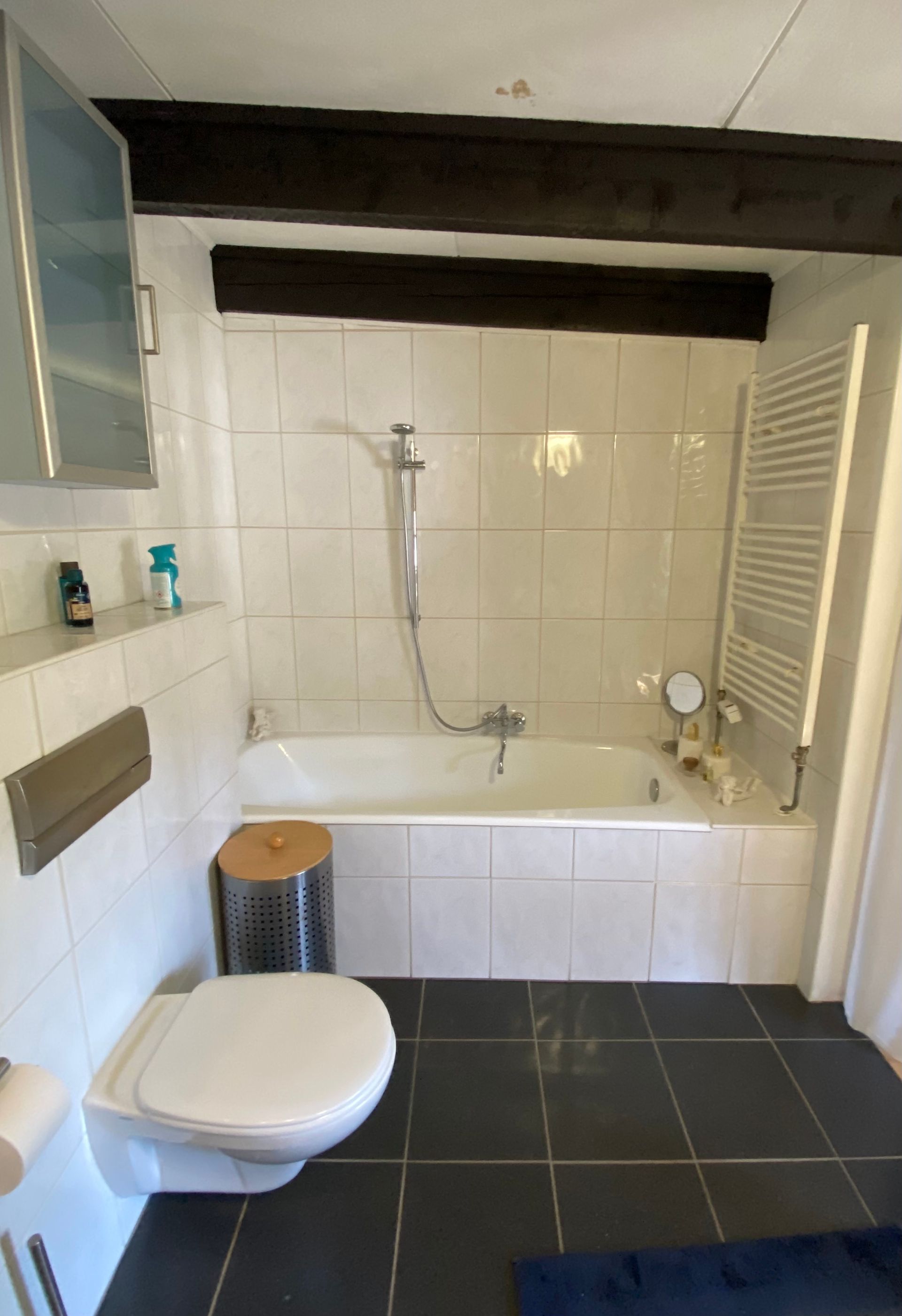 Aansluitend is een riante badkamer met een ligbad, toilet, wastafel en douche.