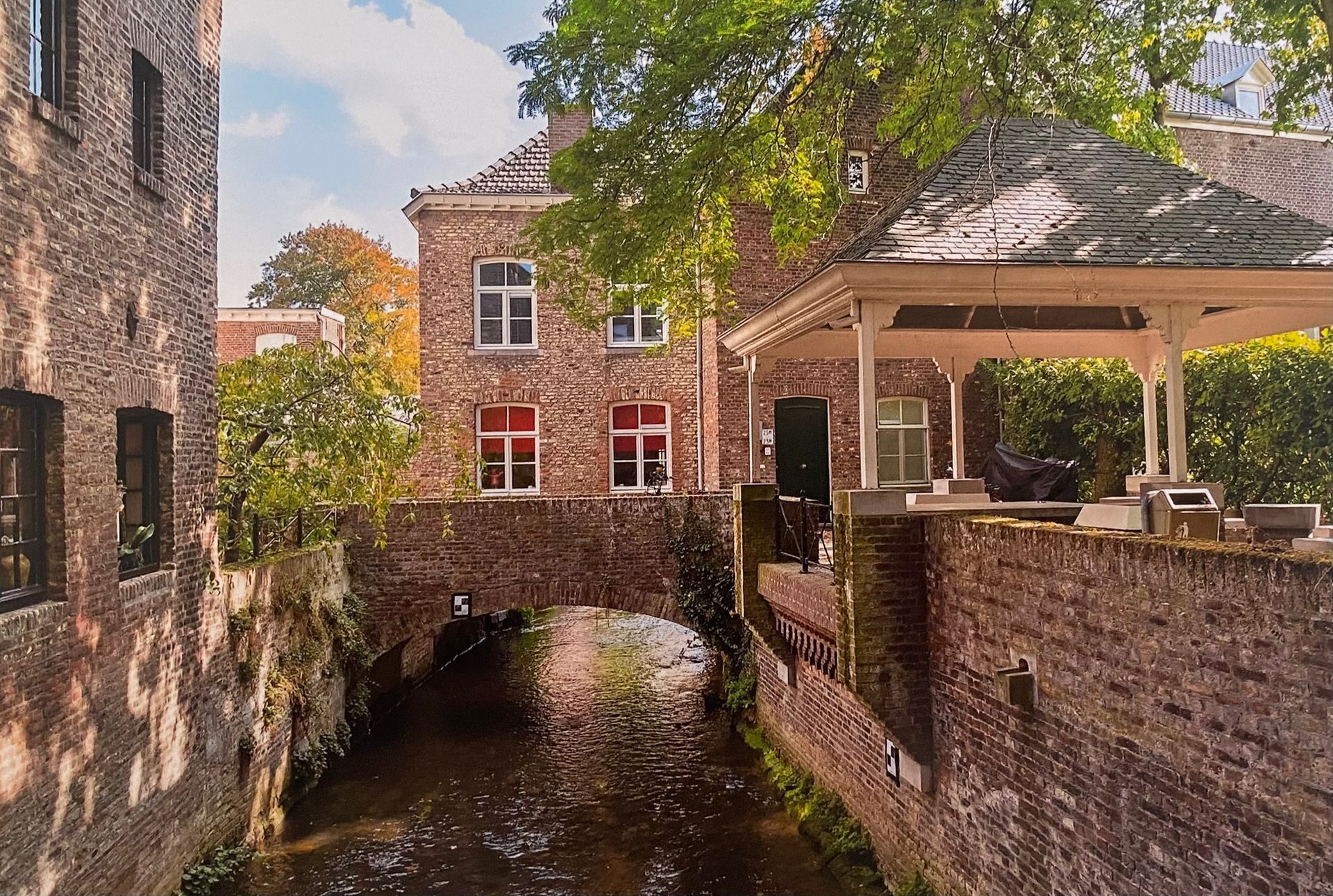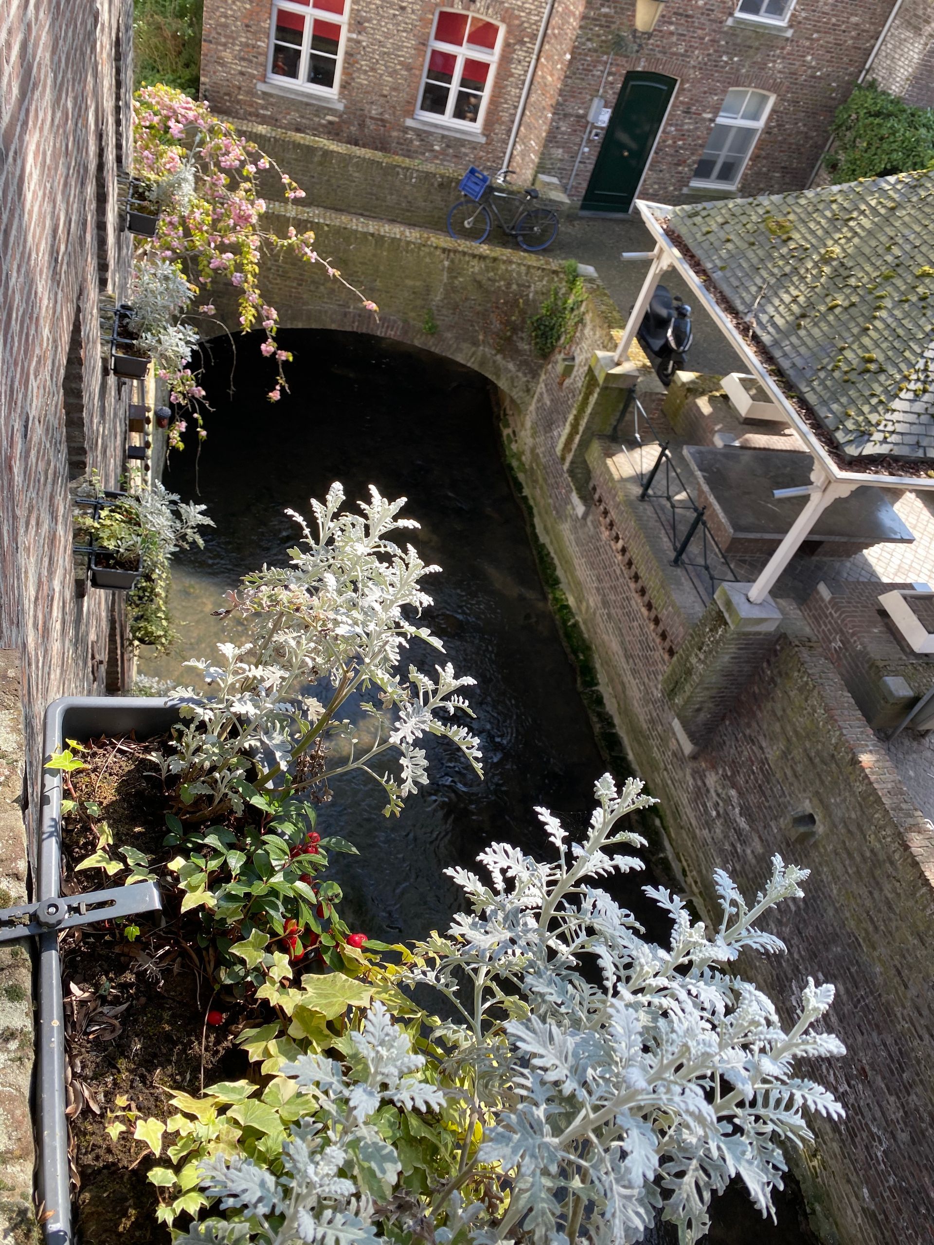 Op de achtergrond een binnenplaats met overdekte zitplaats van het naastgelegen woonkwartier. De stenen kademuren en het bruggetje geven het een waar middeleeuws karakter.