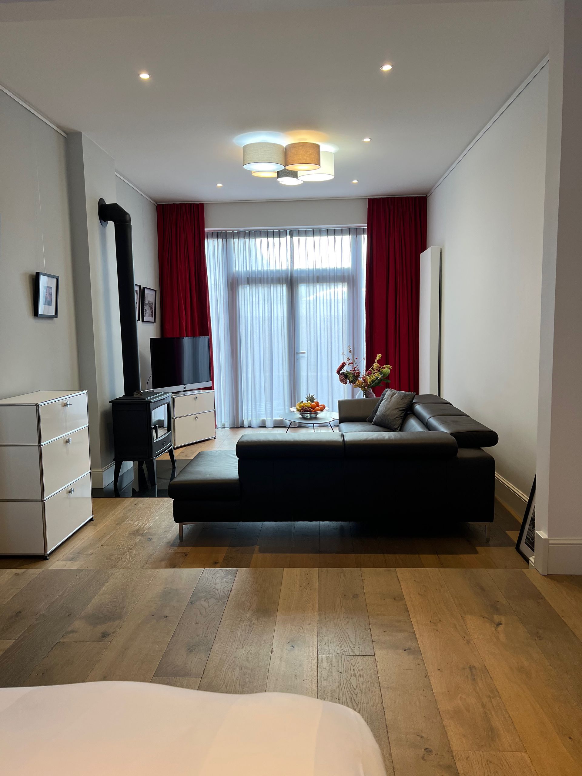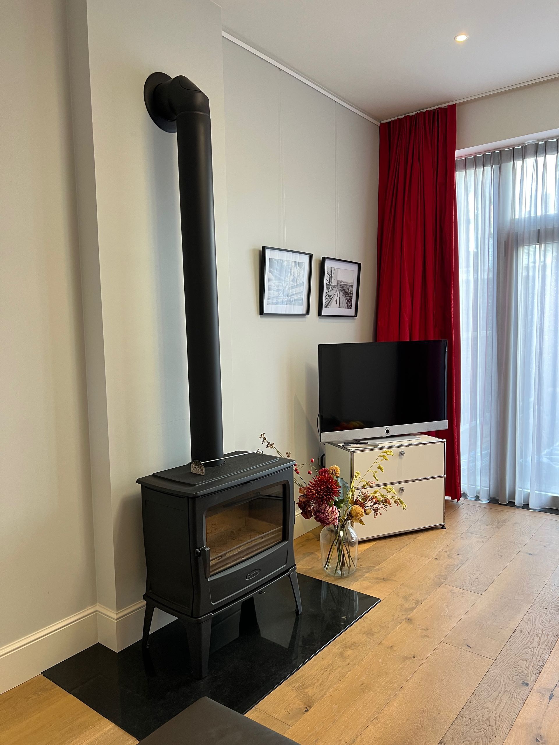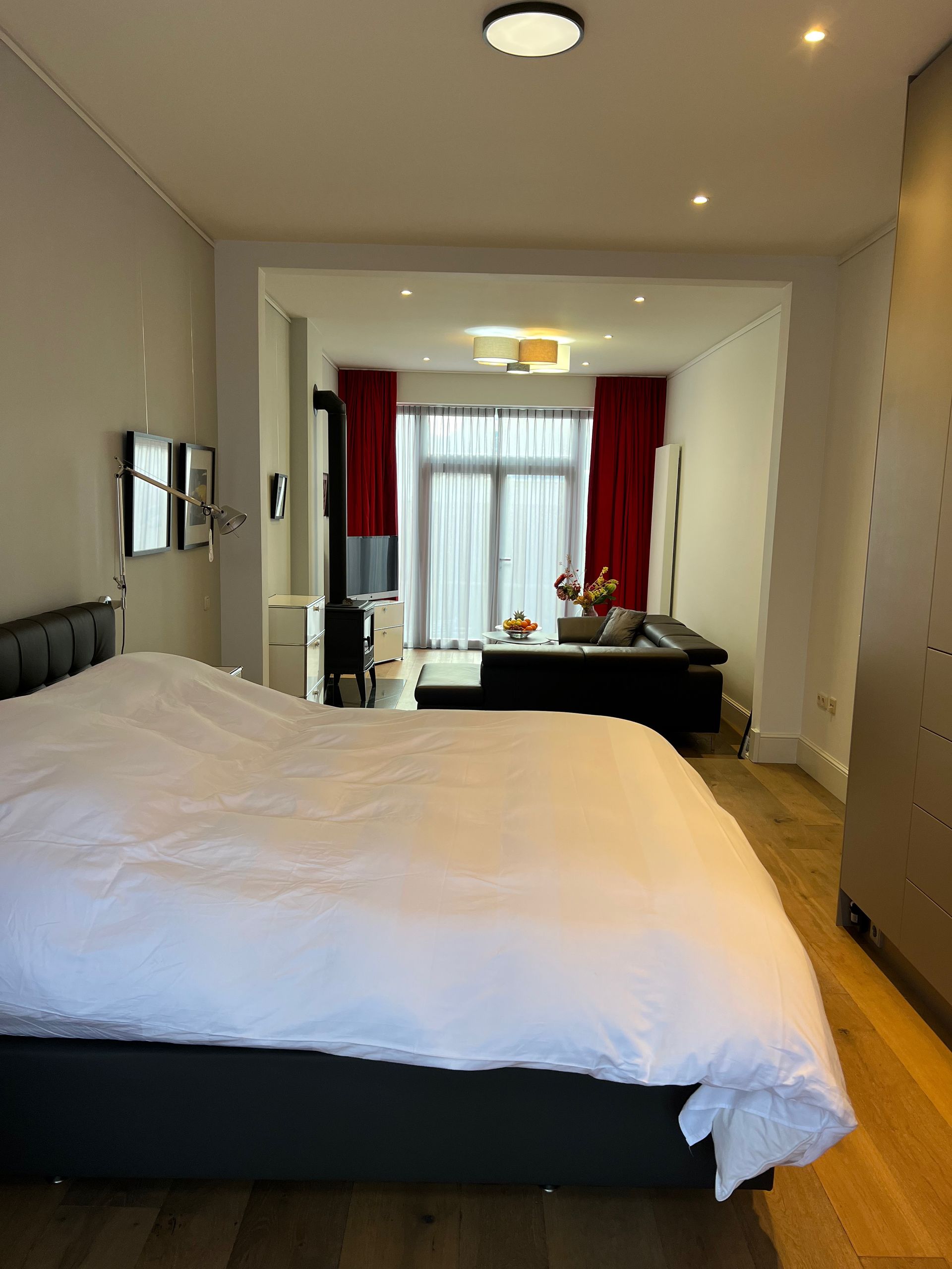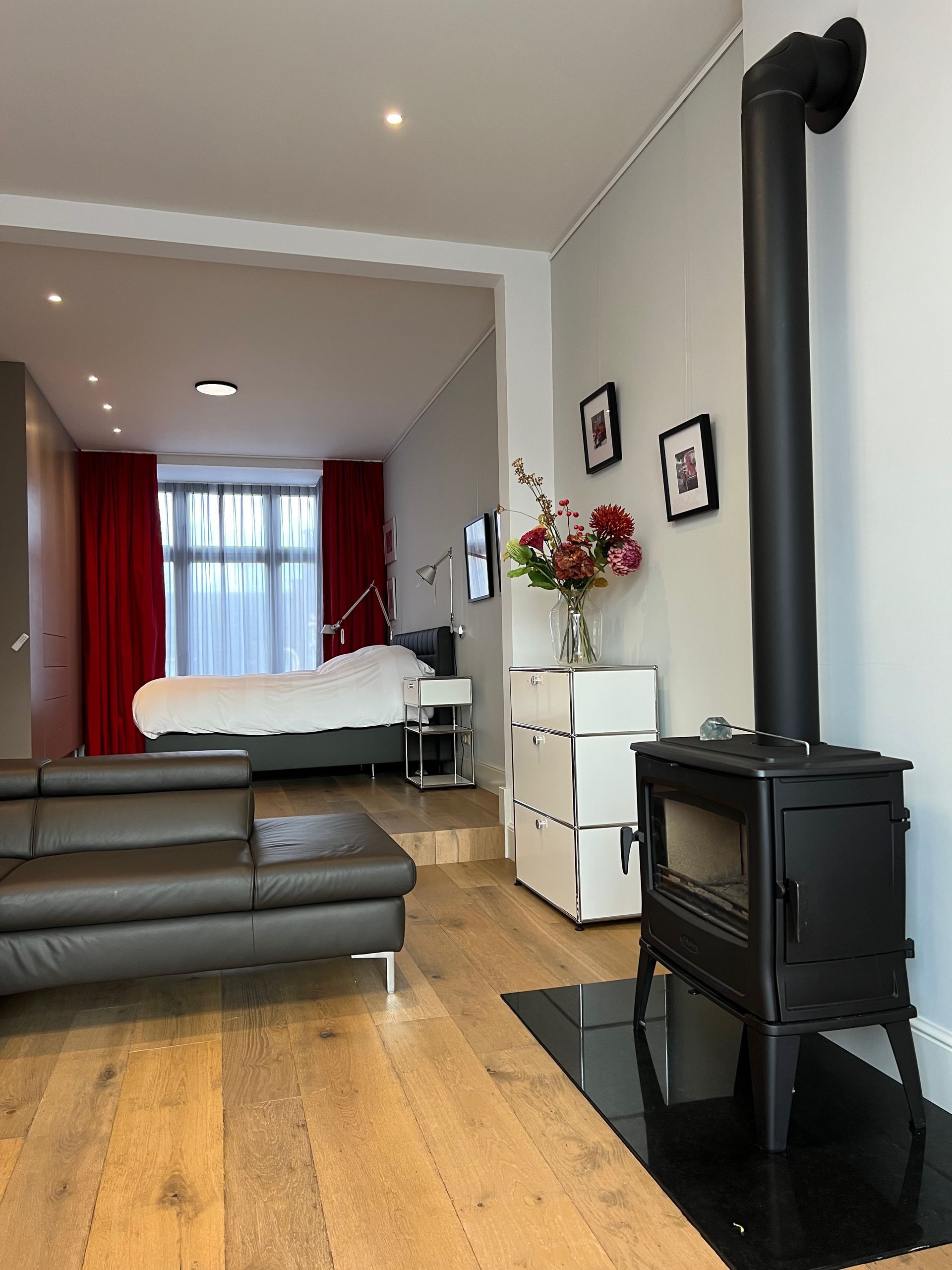 Ruime moderne woonkamer | kachel | open slaapgedeelte | groot 2 persoons bed | royale kledingkast