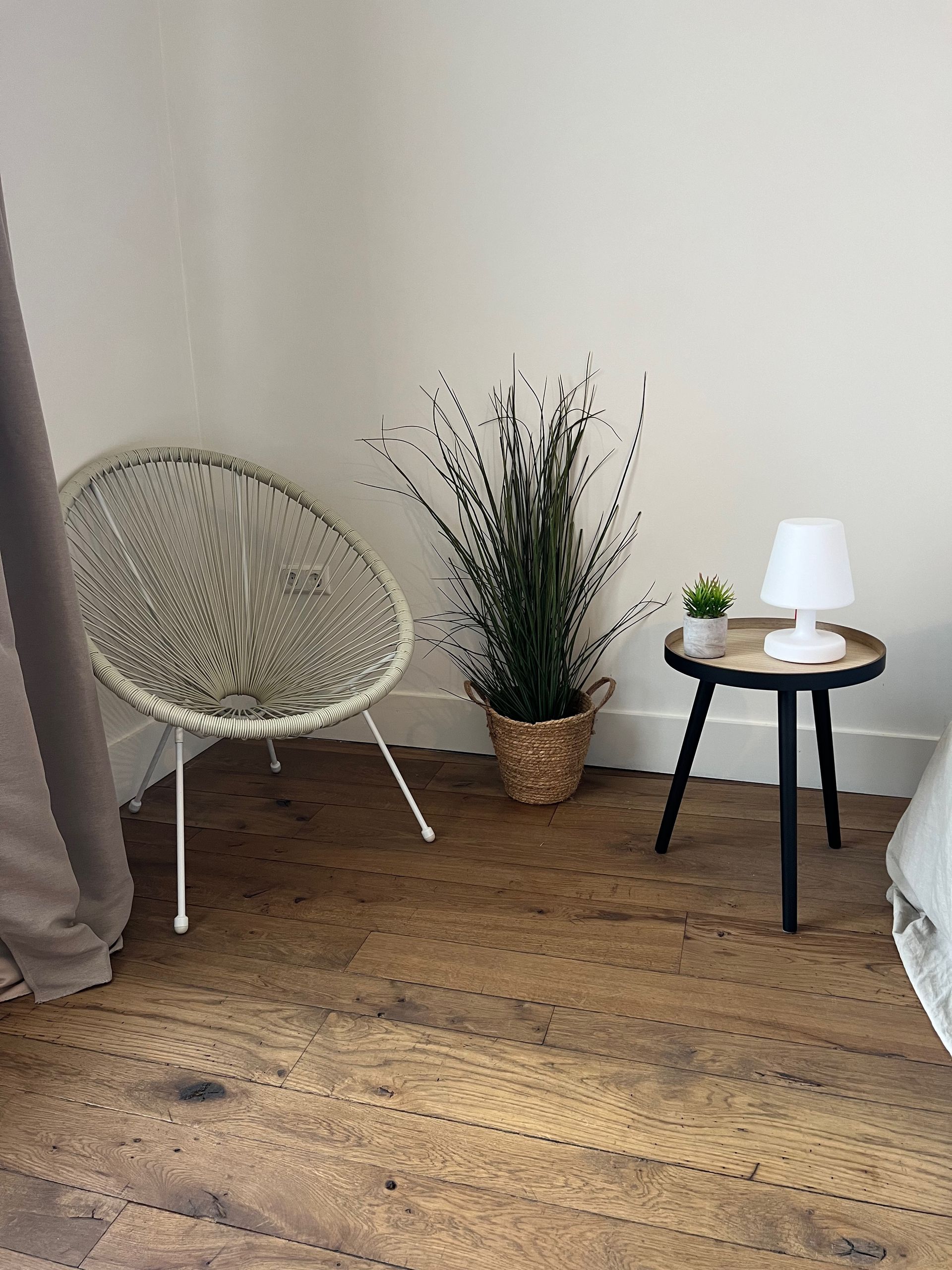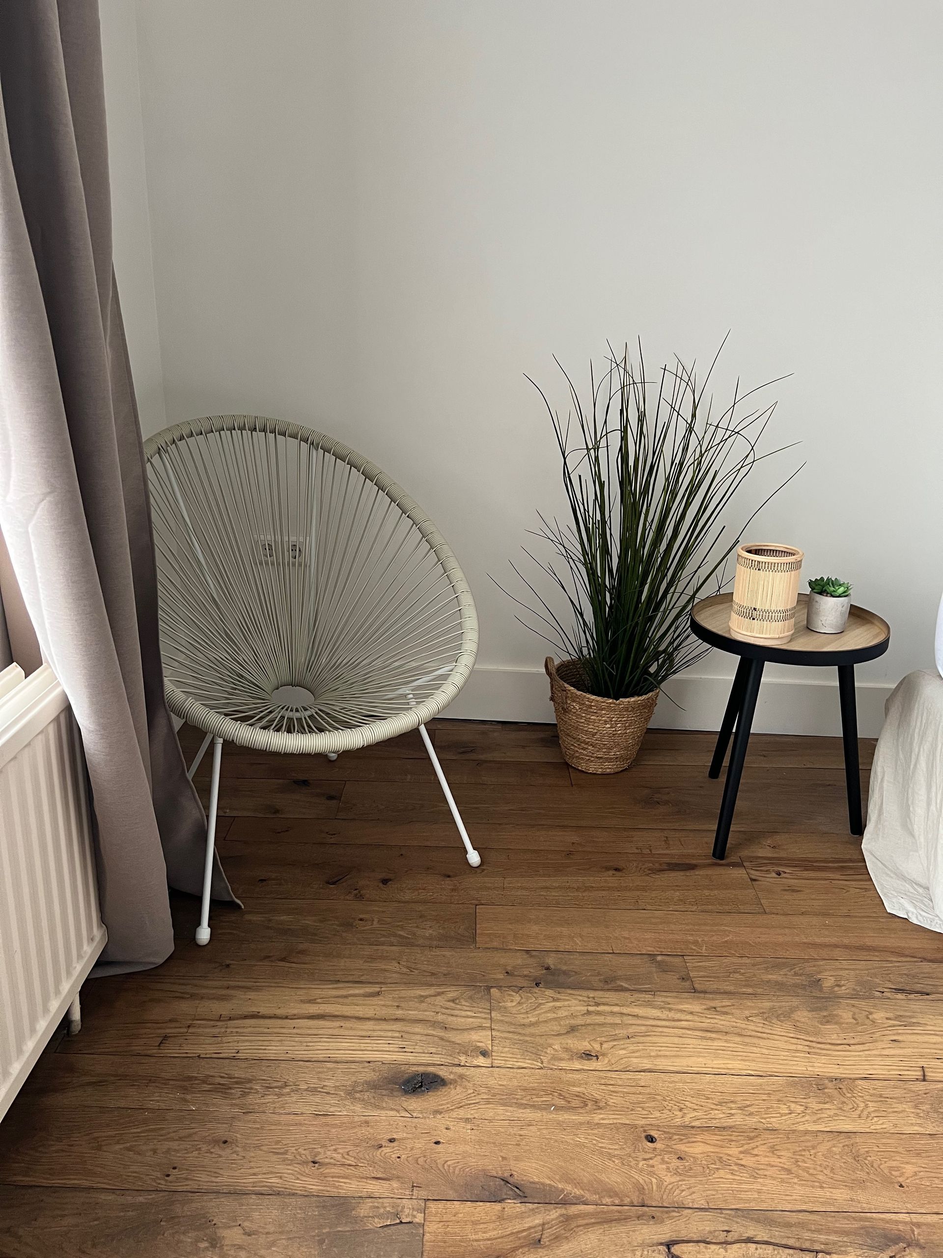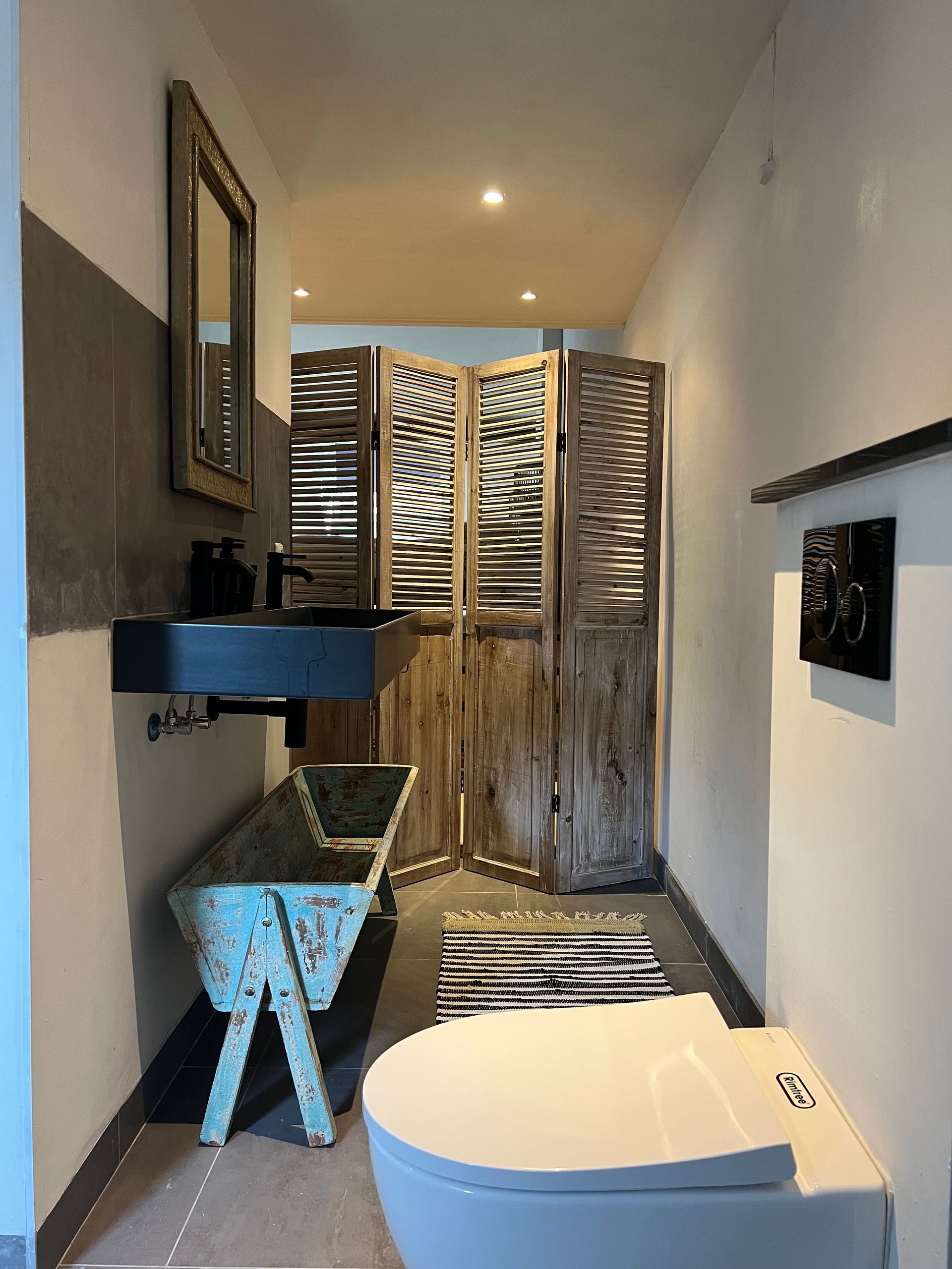 Met de trap omhoog bereik je de eerste etage deze is voorzien van een gezellige woonkamer en een ruime slaapkamer met eigen douche en wastafel.