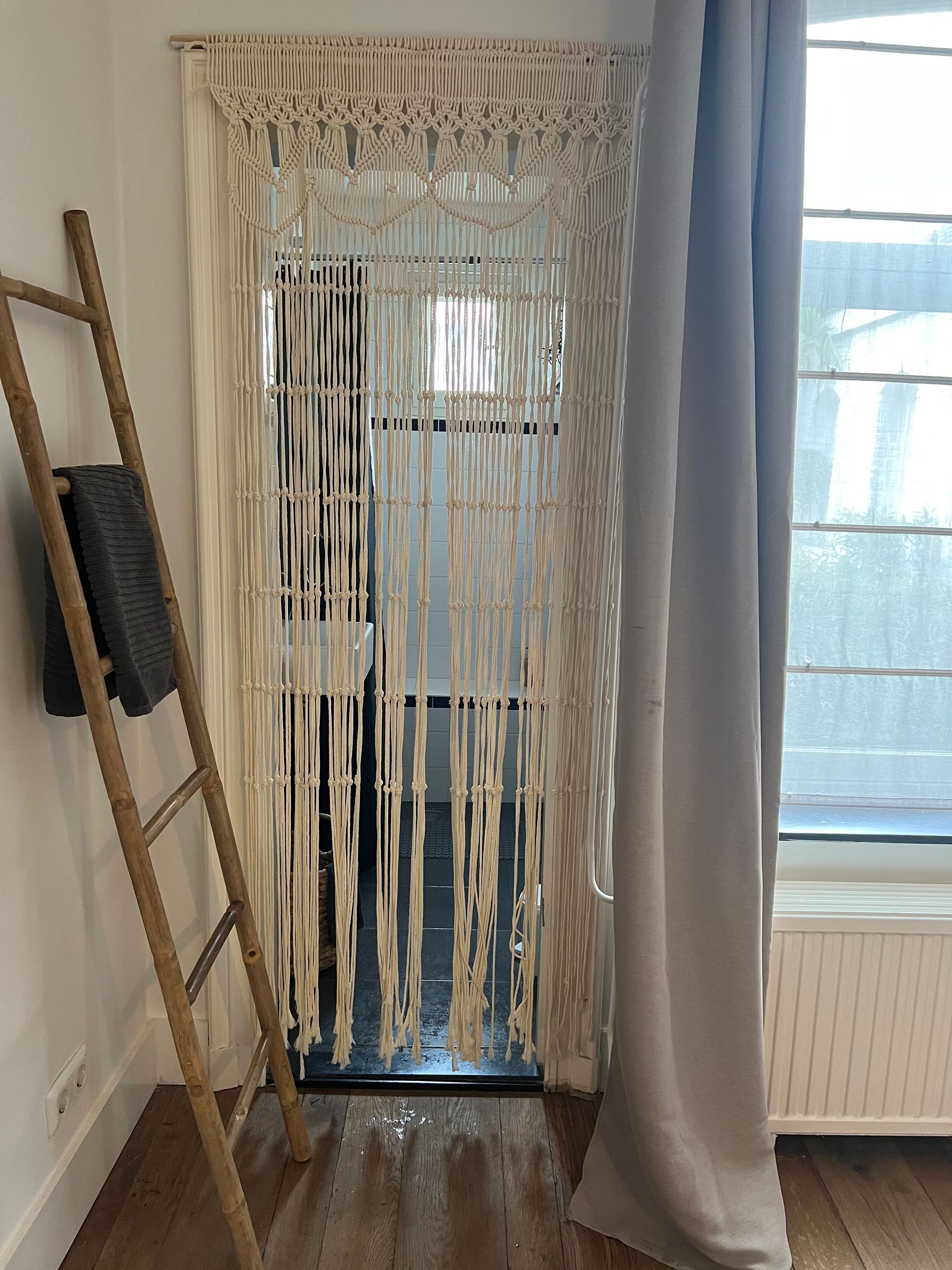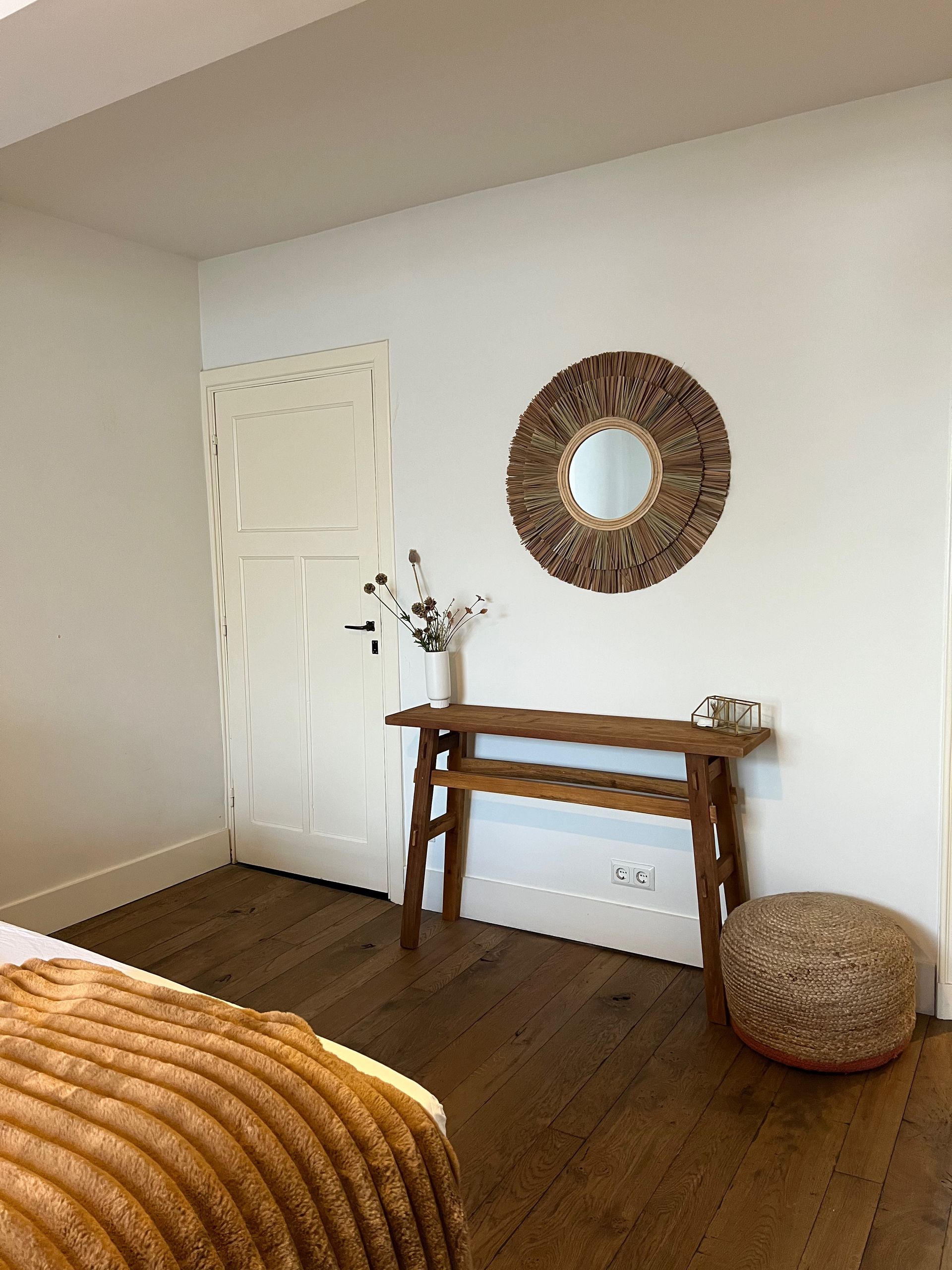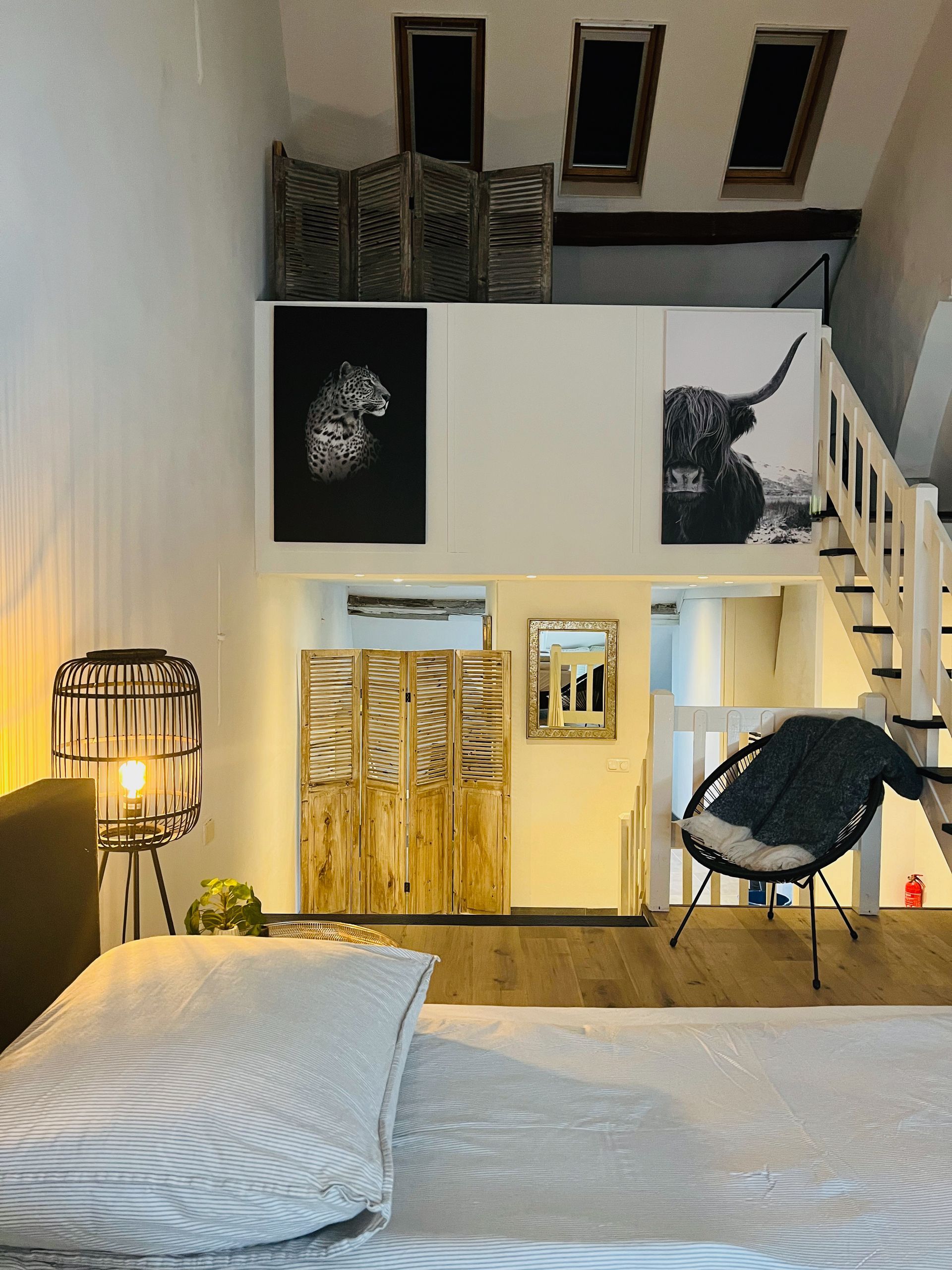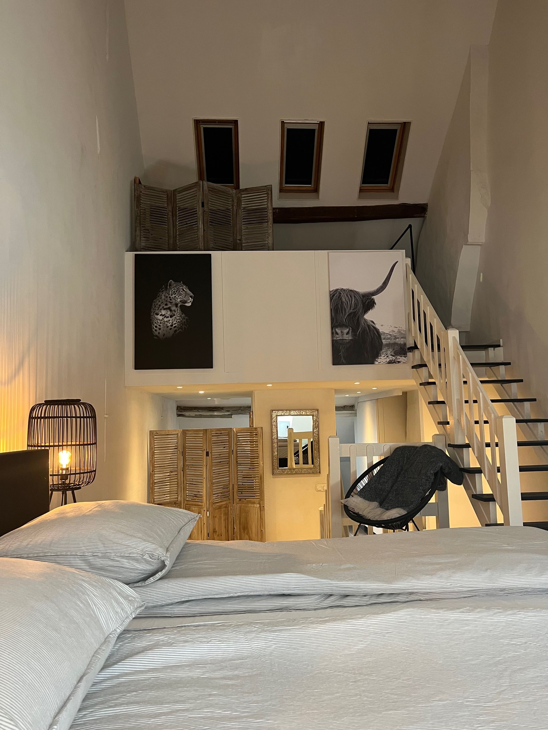 Via de volgende trap bereik je de volgende grote ruimte met een ruime slaapkamer meteen riante badkamer en een woonkamer met slaapbank.